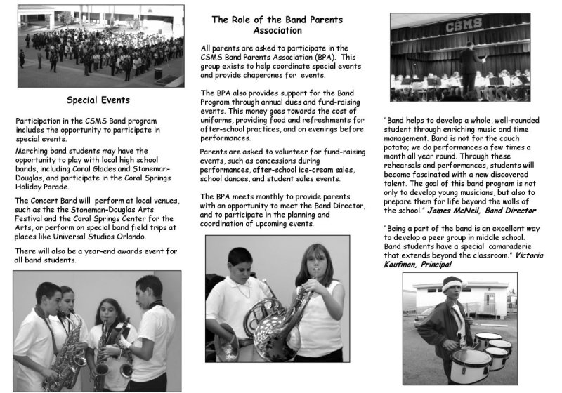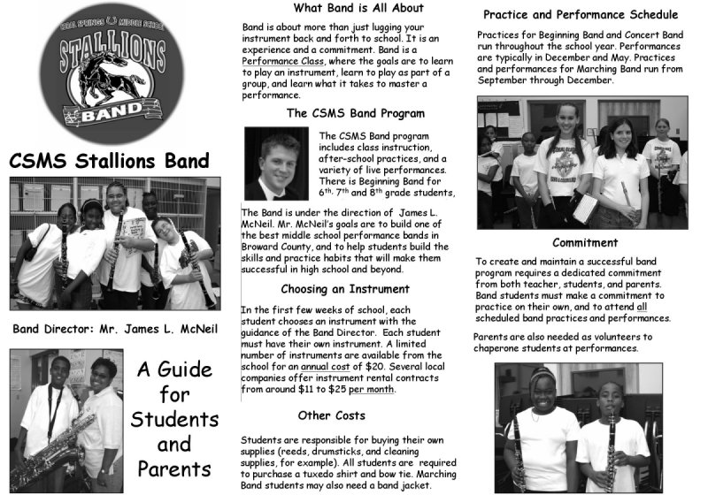 - This is a simple, quick reference intended to answer some basic questions students and parents have about band, and about the CSMS Band Program. You can download it as a PDF File (0.5 MB) or you can view the smaller page images below: