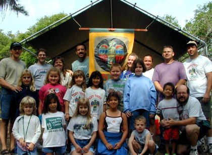 About the HOPI TRIBE The Hopi Tribe was founded in 1998. Our daughters range in age from 5 to 11. We typically have about 8-12 participating families. This keeps the group small enough to meet in our homes. We participate in North Broward nation events, and have a variety of tribal events ranging from canoe trips to juggling classes. The main focus of our Tribe is to provide opportunities for fathers and daughters to "form bonds that last a lifetime" -- through regular group activities with the tribe, father and daughter projects, adventurous outings, and opportunities to share these experiences with the rest of the family. Our logo is the Hopi Thunderbird, and our motto, also borrowed from the Hopi Tribe and Bobby McFerrin is "Don't Worry, be Hopi." Each daughter chooses an indian name for herself and for her father. Her name is announced to the Nation at the first major campout she attends. She also receives a tribal necklace and a tribal arrow. Each event or activity becomes another bead on the necklace. Father and daughter decorate and personalize the dauther's arrow, which she brings to our tribal home meetings. Nation events often include a patch, which can be added to a tribal vest. Tribal History The HOPI TRIBE was formed in 1998. Our first meeting was at the North Broward YMCA during a torrential downpour before the approach of Hurricane Georges. Steve Spanoudis was elected our chief as he was the only one who brought a pencil to the meeting to take notes. Our name was chosen by Meagan Cihak, who researched the Hopi Indians. We also decided that it was an easy name for our then 5-year-old daughters to remember. Our first campout was actually a camp-in on the ground floor of condominiums under construction on the Beach in Dania. Participating were Joe Gautieri with Gina, Joe Ariola with Nikki and Brittany, and Steve Spanoudis with Cathy and Nick. Our first Nation Event was the 1998 Peace River Camp-out and Canoe Expedition. Participaring were Wes Horne and Samantha, Peter Washio with Sarah, Bill Boznos with Nickie, Joe and Valerie Gautieri with Gina, Scott and Janice Cihak with Meagan and Zach. This was immediately after Tropical Storm Mitch, so the Peace River was nearly at flood stage. Scott Cihak began the first in a series of famous canoe spills, unfortunately including his wife Janice and Meagan and Zach. On later outings he learned how to fall into the water without dumping everyone else out of the canoe. This was also the campout where Joe introduced Monsterburgers. Joe later refined the cooking process to include setting the grill and it's surroundings on fire. Tribal Chiefs: